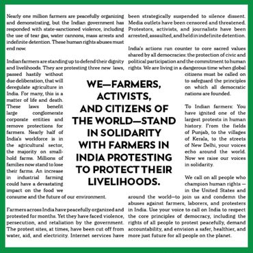 If you would like more information about the #FarmersProtest in India, you can consult this resource curated by a third-party entity. The information at this link has not been created by or endorsed by Justice for Migrant Women.